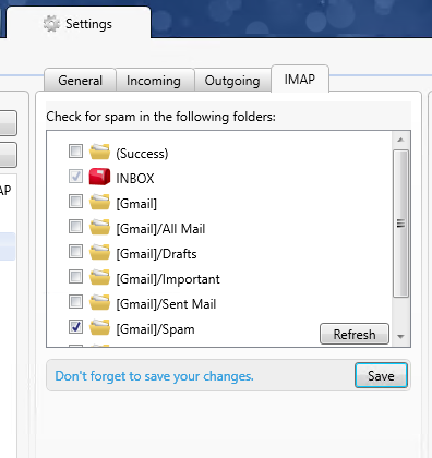 Click the IMAP tab, and check the box [Gmail/Spam], then Save