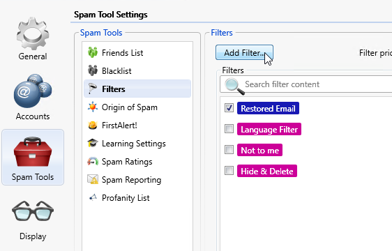 Click Spam Tools, then Filters, and Add Filter